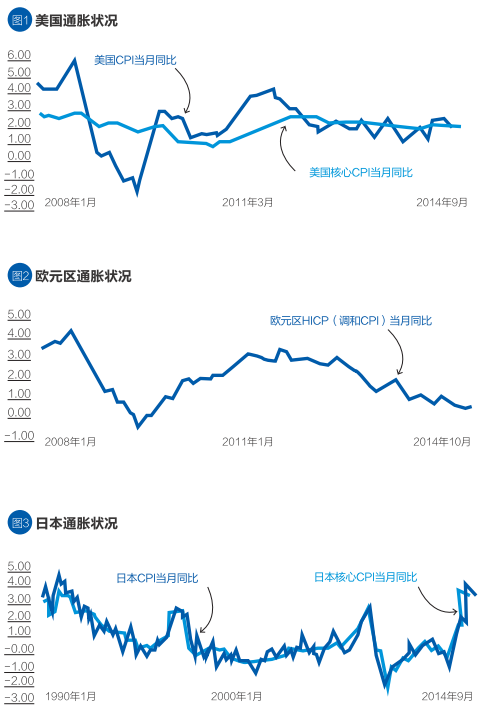 从更为广阔的视野来看,同样执行了非常规宽松政策的欧元区、日本也没有面临通货膨胀的问题(图2、图3)。更有甚者,虽然货币宽松不断加码,欧元区反而一直挣扎在通缩的泥沼之中,而经历了近二十年通缩的日本更是把“提高通胀率”作为安倍新政的成就之一。