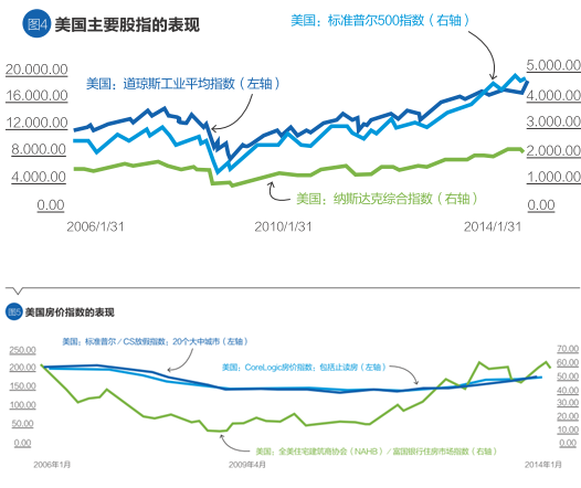 如果考察美国的QE政策对于资产价格的影响,我们会发现与通货膨胀的“麻木不仁”相比,资产价格对货币刺激的反应却相当明显。从股票市场(图4)来看,美国三大股指自2009年以来基本维持了持续上涨的态势,目前已经远超金融危机之前的高点;从房地产市场来看,自2009年以来也出现了显著的回升,某些房地产综合统计指数甚至也已超过了金融危机前的高点(图5)。