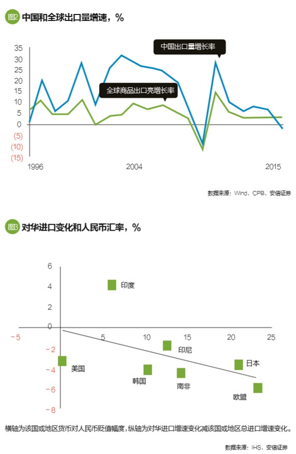这样的横断面观察表明,自2014年中以来,人民币汇率盯住美元,相对于很多国家或地区的货币出现了显著的升值,这对中国出口品竞争力造成了损害,并导致了2015年中国出口量较全球更快地萎缩。