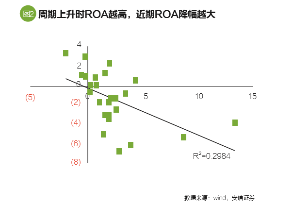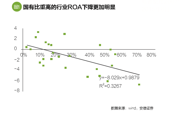 笔者从横向、纵向两个维度研究横断面数据。在横轴上选择不同行业国有资产占比情况,纵轴上选择这些行业的ROA与长期历史均值的背离。
