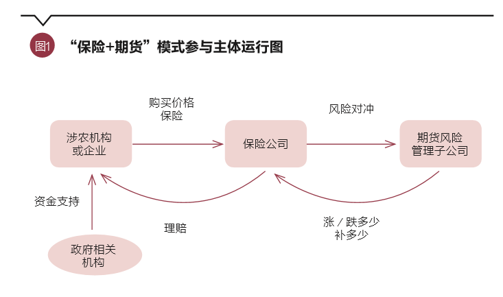 “保险+期货”模式。农户是市场的弱势群体,通常只能被动接受市场价格波动,丝毫没有议价能力或话语权,场外衍生品的出现为农户和涉农企业带来锦囊妙计。“保险+期货”模式参与主体主要有三方,运行初期的资金支持通常由政府相关机构支持,具体运行如图1所示。“期货+保险”模式开展以来,取得较好的应用效果及社会价值。一是切实帮助企业管理价格风险,使其稳步运营;二是丰富保险公司险种类别,利用保险公司优势,响应国家服务“三农”号召;三是推进期货风险管理子公司场外业务拓展,丰富场外业务服务企业类型;四是促进金融市场、实体经济健康、快速发展。