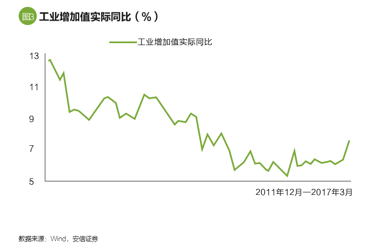 但过去几个月陆续公布的增长数据应该说总体上是超预期的。以工业为例,2017年1月-2月工业同比增速6.3%,较此前小幅回升;3月工业增速更是显著攀升到7.6%,创2015年年初以来的最高水平。一季度国内生产总值(GDP)增速也是在工业和房地产销售回升的带动下进一步回升到6.9%。