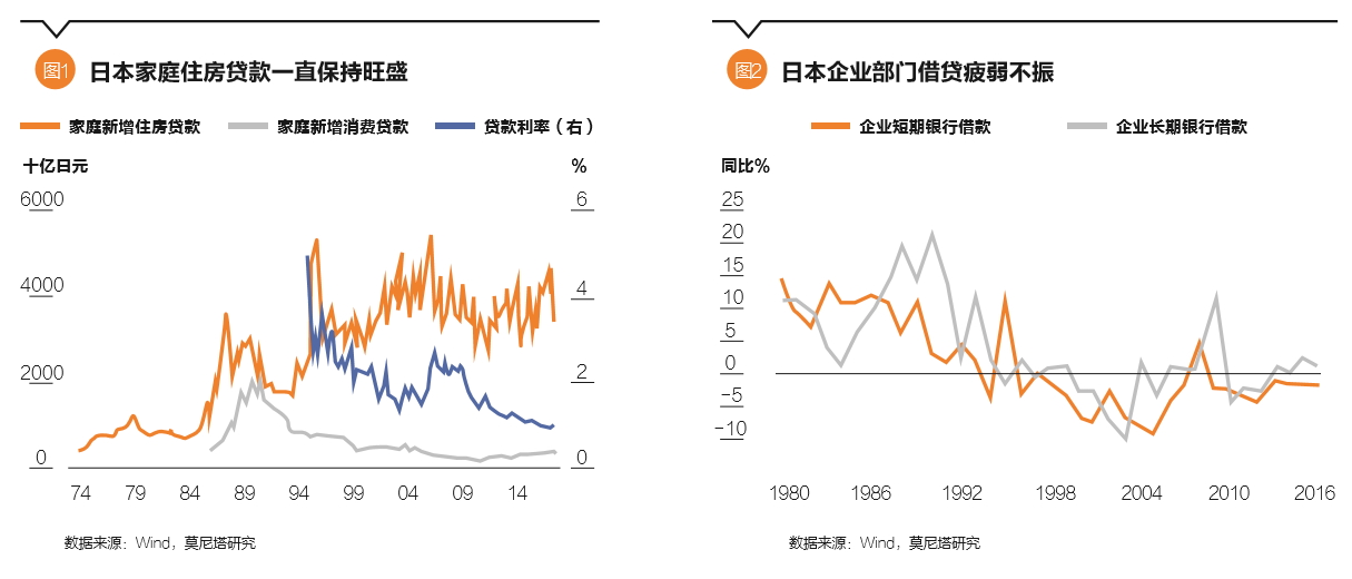 从居民端来看,在多年QE的带动下,日本贷款利率已被压低很多,失业率也降至历史低点,但日本个人消费贷款新增额仍徘徊于低位。原因可能有二:一是,日本民众在过去15年通缩环境中形成的消费习惯一时难以改变;二是,居民工资增速尚未出现显著增加。虽然日本家庭住房新增贷款在过去15年内一直处于高位,但以刚性需求为主的购房显然难以明显带动物价回升,如图1所示。