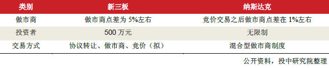 投中研究院预计,三种交易方式推出后,企业可以自主选择其中一种作为其股票转让方式。而美国纳斯达克市场,则是采取“混合式”交易模式,即做市商能够以投资者的身份与普通投资者参与竞价交易。