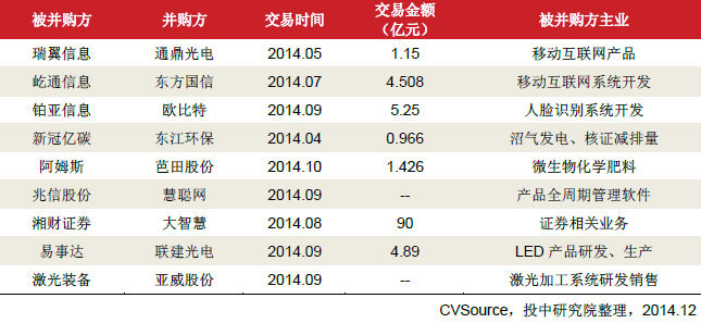 被收购标的企业普遍具有核心技术或资源,如铂亚信息在人脸识别领域拥有多项关键技术,阿姆斯拥有微生物菌剂培养核心技术,新冠亿碳在气体发电领域深耕细作,易事达在LED 高清显示屏方面优势明显。8家被并购新三板企业,涉及金额逾百亿元。其中2014年8月,大智慧90 亿元收购湘财证券更是引起市场强烈关注。新三板俨然成为上市公司收购标的池。在9 家被上市公司收购企业中,除湘财证券外,其余有6 家均集中在信息技术行业。