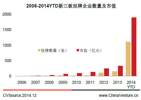 2013年底,国务院继续颁布《关于全国中小企业股份转让系统有关问题的决定》,新三板挂牌企业试点迅速扩大至全国范围。截止2014年12月15日,新三板挂牌公司数量接近1500家,是2013年挂牌公司数量的近4倍,总市值合计超过2000亿元。