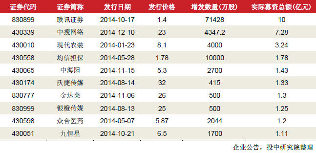 新三板公司定增融资估值和规模与主板和创业板同行业相比,仍有较大差距。排除九鼎投资的超大体量募资金额后,平均每家企业定增募资为0.23亿元。就2014年新三板企业定增募资额来看,除去九鼎投资外,仅有三家企业募资总额超过3亿元,其余前10位企业募资总额均在1亿元上下,也说明市场活跃度仍有待提高。