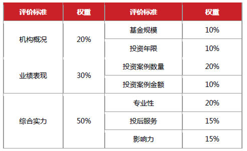 依托CVSource金融数据终端所提供之数据,从基金规模(新三板主题投资)、投资年限(新三板投资)、投资案例数量、投资案例金额、专业性、投后服务、影响力等多个维度进行综合评比,相关标准权重如下表所示。