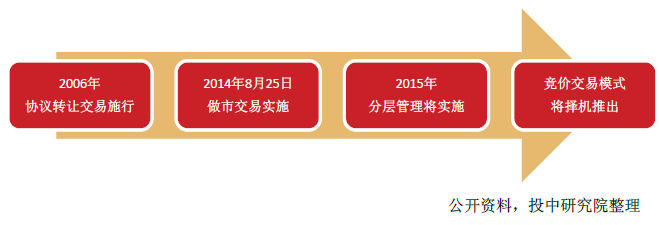 在新三板挂牌企业数量逐步取得突破的背景下,新三板交易方式也迎来快速变化的格局,2014年5月19日,新三板市场启用新交易结算系统,原代办股份转让系统退出历史舞台;8月25日,全国股份转让系统做市转让方式正式实施,增强了市场流动性。另据监管层透露,竞价转让交易将在2015年初择机推出,新三板有望进一步提升交易效率。