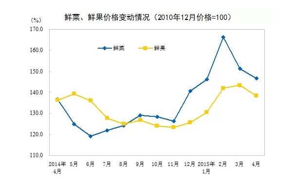 2015年4月份,全国居民消费价格总水平同比上涨1.5%。其中,城市上涨1.6%,农村上涨1.3%;食品价格上涨2.7%,非食品价格上涨0.9%;消费品价格上涨1.3%,服务价格上涨2.1%。1-4月平均,全国居民消费价格总水平比去年同期上涨1.3%。