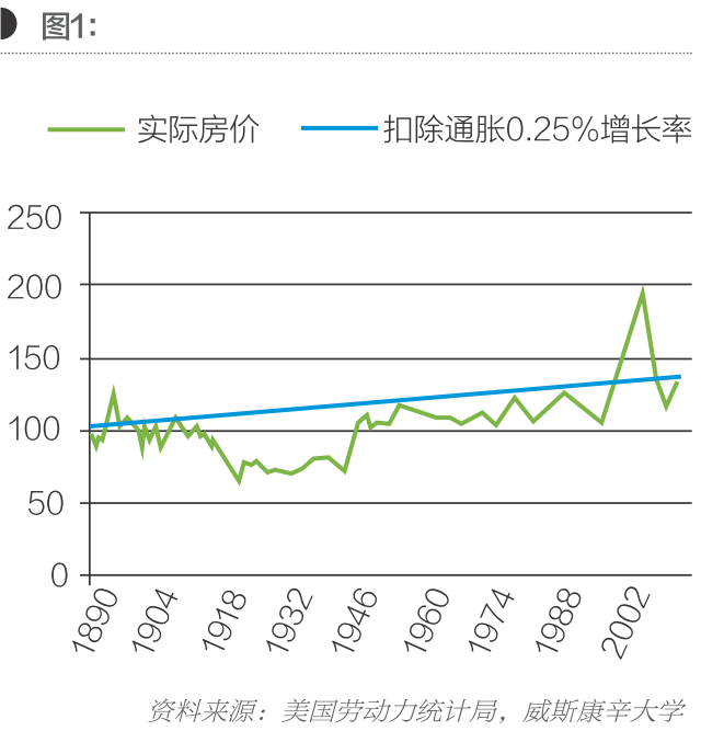 图1表现出美国房市的两个规律。第一,美国房价的长期增长率为3.07%,略高于美国通胀率。第二,如果房价变动偏离这条轴线,无论太高或太低,其后的趋势都可以预测,即会回到这条轴线。