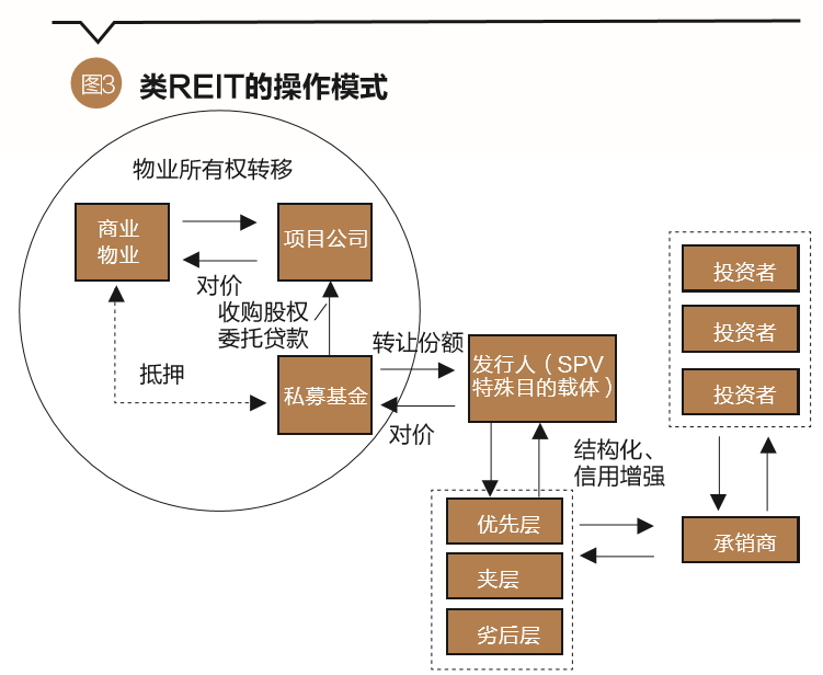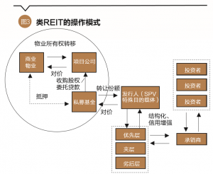 CMBS作为资产证券化的一个重要类别,实质上是债券。但与普通企业债不同的是,它是一种结构性债券,基于的是基础资产信用。债券具有时效性,即有一定的存续期限。不但如此,CMBS是有资产抵押的债券。虽然物业所有权在CMBS过程中没有发生转移,但借款人的违约会导致物业被拍卖以偿还投资人。具有股性的、永续性的REIT不存在资产抵押的问题,不属于债券,也不属于资产证券化范畴。由于国内没有REIT的相关立法,严格意义上的REIT也并不存在。国内所谓的REIT产品都具有存续期限,其功能也为融资而非物业运营管理。因此,这些产品在功能上和形式上都不是REIT,只能被称为类REIT。