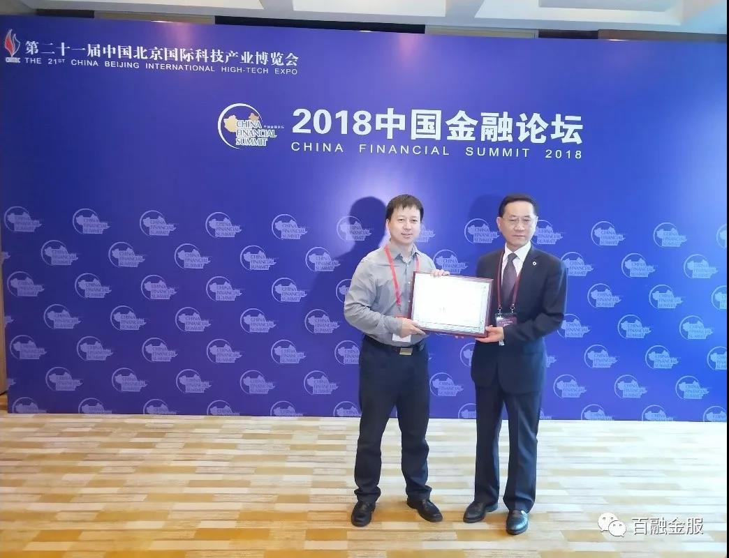 中国开发性金融促进会执行副会长、国家开发银行原行长李吉平为百融金服颁奖