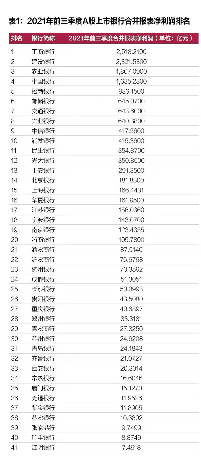 2021年前三季度,41家A股上市银行的净利润合计为1.4739万亿元,其中国有大型商业银行和股份制商业银行是主要的利润贡献者。6家国有大型商业银行前三季度的净利润占全部上市银行净利润的65.3%,9家A股上市股份制商业银行占24.9%。