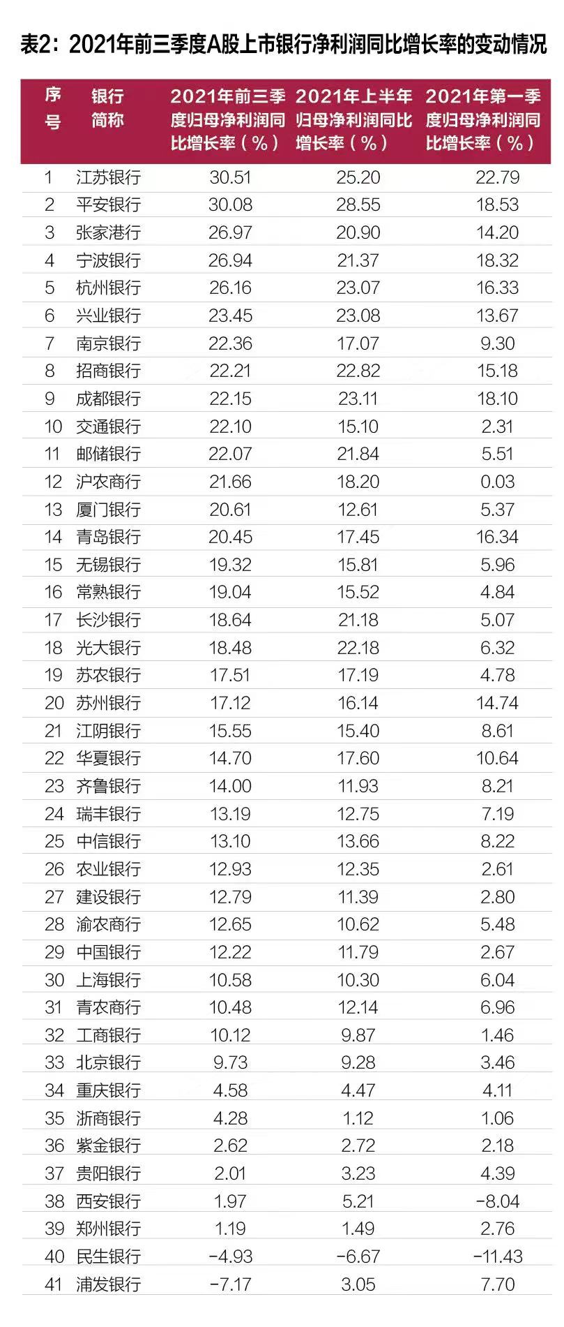 多数A股上市银行的前三季度净利润同比增长率高于2021年上半年以及2021年第一季度的同比增长率。而且从表二中数据可以明显看出,2021年第二季度以来A股上市银行净利润增长显著提速。