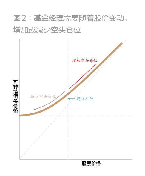 比如,随着股价上涨,期权成分逐渐趋向“价内”,可转换债券会对股票价格变得更加敏感。可转换债券的“得尔塔值”随之上升,因此,套利者必须做空更多的股票来调整对冲。反之,当股价下跌时,期权的性质就更趋向“价外”,“得尔塔值”下降,套利者需要回购部分股份,以减少对冲(图2)。这意味着随着股价的波动,套利者需要一次又一次地调整对冲,这种低买高卖的动态“得尔塔值”对冲过程会产生收益。换言之,无论是上涨还是下跌,不断变化的“得尔塔值”始终有利于长期可转债的整体仓位,其正股建立了对冲空头头寸。这种特点被称为“长伽马”(伽马描述了与股价变动相伴随的“得尔塔值”变化率)。
