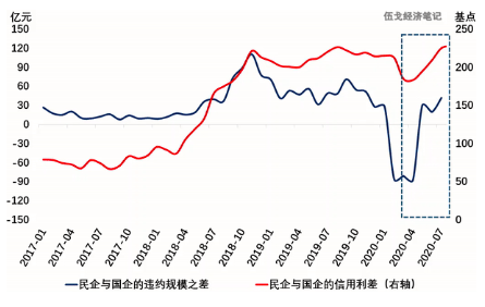 从企业的角度看,近期企业资金成本总体有所下降,但民企相对国企的债券融资成本等却仍在攀升。事实上,疫情以来民企相对国企债券违约规模大幅攀升,尤其批发零售等行业较为明显,民企的信用风险及融资成本显著抬升。这些都折射出疫情这种特殊冲击对民营和中小企业的影响明显大于其他企业。