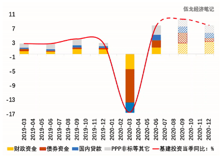 注:图中各项资金是其对基建投资增速的拉动值。财政资金包含预算内资金和政府性基金,债券包含专项债、特别国债和城投债。