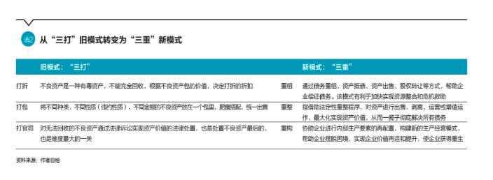 传统不良资产处置模式包括“打折扣、打包、打官司”,即业内所称的“三打”模式。这些模式现已不能完全适应新时期的市场环境,向“三重”——重组、重整、重构转型升级势在必行(如表2所示)。在过去一个阶段的不良资产处置历史中,信达资产从传统型的“三打”处置模式改为“三重”的新型处置模式,救助了更多处于危难之中的企业,发挥着救死扶伤的重要功能。当前,防范和化解金融风险已成为党和政府的重要攻坚任务之一,经济下滑压力给金融领域的健康发展带来诸多不利,对于未来的AMC公司来说,不良资产的质量和处置难度要超过历史上任何一个时期。在这种背景下,地方AMC在专业人才、公司治理、处置技术等方面存在不少短板,如何用有限的资本金成功处置区域内的不良资产成为考验地方AMC的重要难题。信达资产的不良资产处置模式,为这些小型的地方AMC公司提供了可能的业务方向,一方面应将有限的资本金用在符合国家产业发展方向和战略引导的问题企业上,另一方面要探索多元化、专业化的“三重模式”,将宝贵的金融资源用好并体现出AMC公司的“金融防火墙”和“经济安全网”的重要作用。
