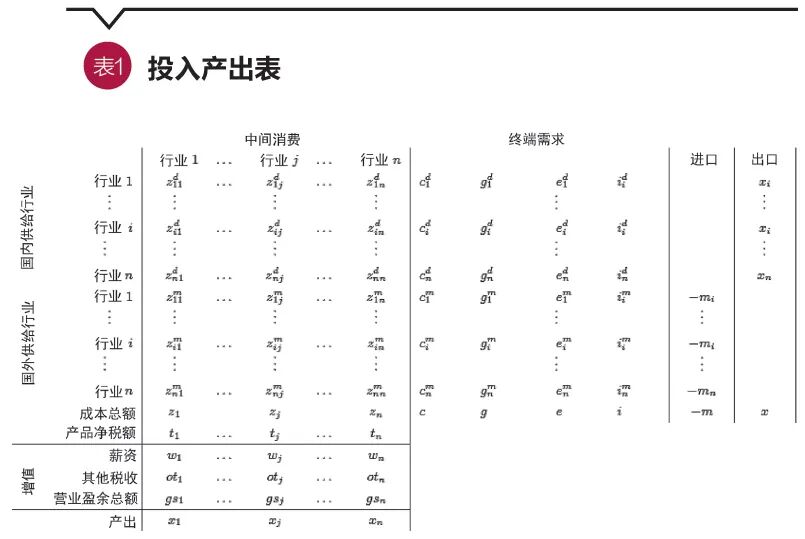 投入产出表是一个矩阵(见表1),呈现经济活动中发生的所有商品和服务的交易。其中列表示需求消费端,行表示供给产出端。交易分为两类:中间消费和终端需求。如表1所示,左上象限代表了生产过程中两个生产部门之间的中间消费(例如,农民供应的玉米被餐馆用来制作饭菜);右上象限表示终端需求;最右两列显示了所出售商品和服务是来源于本地还是进口;最后,投入产出表底部还显示了如何分配税收、工资和总营业盈余(Gross Operating Surplus,简称GOS)之间的增加值(定义为部门销售与其中间消费之间的差额)。
