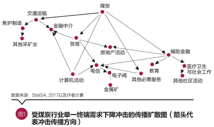 以南非煤炭和汽车出口行业为例,本文通过静态投入产出模型,分析外源性低碳转型冲击对产出和就业的间接影响,并量化这些间接影响的损失。在此基础上,将该方法得出的结果与金融统计数据相结合,识别出最有可能导致潜在金融风险的行业。