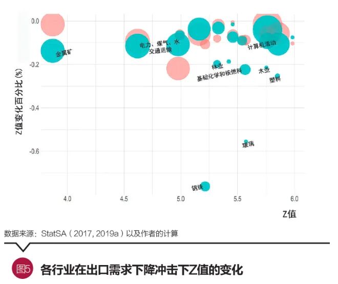 在分析净债务与EBITDA比率变化的基础上,本文还评估了两种出口冲击对Z值的影响。Z值越低,公司价值越接近零,越有可能面临破产,破产等价于债券违约。如图5所示,气泡大小代表各行业的负债水平;横轴代表行业的初始Z值;纵轴代表Z值受不同冲击后的变化程度。为了易于展示,图中仅显示初始Z值低于6的行业。我们发现,尽管就Z值的初始值和变化程度而言,前述行业(钢铁、玻璃、金属矿石、电力、天然气、水和运输)仍然与其他行业差距明显,但其他行业的Z值相对较高。