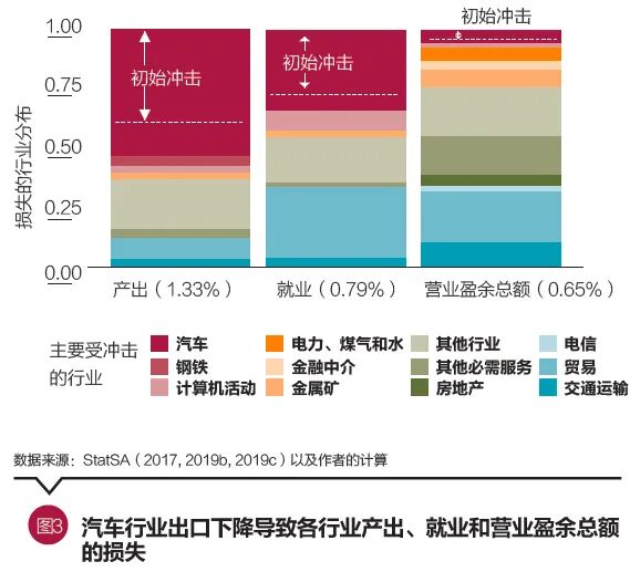 图2显示了在煤炭行业出口需求减少的情况下,产出、就业和营业盈余总额(Gross Operating Surplus,简称GOS)的相对损失。图3显示了汽车行业受冲击后前述指标的表现。如图2所示,条形图不同颜色的柱形的高度对应特定行业的产出、就业或营业盈余总额的损失;而箭头覆盖部分表示初始冲击造成的直接损失,总损失则以南非经济总体的产出、就业或营业盈余总额的损失占比,在条形图的下方显示。举例来说,煤炭出口冲击造成的产出损失占南非GDP总值的0.93%,失业率(新增失业人口占全体就业人口的比例)新增0.42个百分点,营业盈余总额损失为1.57%;汽车行业冲击对应的数字分别为1.33%、0.79%和0.65%。