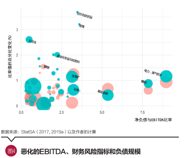 如图4所示,通过前述产出与EBITDA之间的非线性关系(EBITDA弹性),可以确定两种出口冲击导致的EBITDA损失。图中气泡的大小,代表每个行业的债务总额(包括短期和长期债务);气泡的颜色代表两种不同的冲击来源:红色气泡代表煤炭出口下降冲击;蓝色气泡代表汽车产业出口下降冲击。横轴表示初始财务风险指标(净债务与EBITDA的比率);纵轴表示在每种冲击后风险指标的变化。为了便于展示,图中省略了一些表现极端的行业。例如家具和电子阀门行业,其净债务与EBITDA的比率超过20,并且受两种冲击的敏感度(纵轴表示的变化率)都相对较大,约为2%;钢铁、皮革和箱包基础制造业而言也是如此,在遭受汽车行业出口冲击时,尽管这些基础制造业的净债务对EBITDA的初始比率较低(小于2),但受冲击后的变化却非常高(约10%,图中未显示)。在遭受煤炭出口冲击时(红色气泡代表),电子阀门和家具(图中未显示)以及电力、天然气、水和交通运输(以及辅助金融服务)行业的净负债/EBITDA比率变化都相对较高,方差较大。