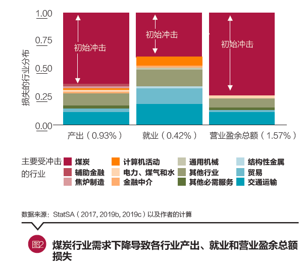 煤炭需求下降会导致约三分之二的以名义总产量计量的初始冲击损失。这意味着,由于煤炭部门对其他行业的商品和服务减少采购,煤炭出口业务每减少两个兰特的产出,其余经济体就会遭受一个兰特的损失及后续连锁反应的影响。其中,受影响最大的行业是运输和贸易。当查看其他两个受影响的变量时,相对影响差异很大。煤炭行业是资本密集型企业,其营业盈余总额的间接损失仅占直接损失的1/3。另一方面,由于煤炭部门的劳动密集程度相对较低,就业机会的间接减少数量达到直接减少数量的大约两倍。这意味着在煤炭出口业务中,每一个可能消失的岗位,对应的其他行业中还有另外两个岗位面临着相同的风险。类似地,如图1所示,受供应链结构的驱动,运输和贸易在部分就业岗位和产出中起着关键作用,在观察这些岗位和产出相关信息时,我们发现了受影响行业的一致性。但是,不同行业的资本或劳动强度不同,行业的相对损失也有所不同。这表明,在评估外部转型冲击时,经济的结构和行业特征都非常重要。