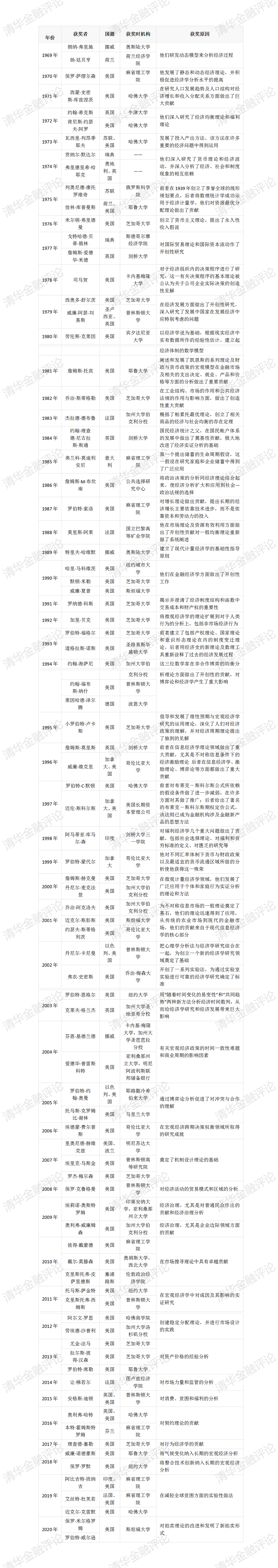 1969年诺贝尔经济学奖首次颁奖。诺贝尔经济学奖的甄选委员会通常在每年10月公布得主,颁奖典礼于每年12月10日,即诺贝尔逝世周年纪念日,在瑞典斯德哥尔摩举行,并由瑞典国王亲自颁奖。截止至2020年10月,诺贝尔经济学奖一共颁发了51次,加上今年的两位,共有86人获奖。