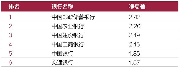 从净息差来看,6家大型商业银行也存在一定差距,其中,邮储银行2020年净息差达到2.42%排在第一位,农业银行、建设银行和工商银行净息差也均超过了2%,中国银行和交通银行未达到2%,分别为1.85%、1.57%排在第五、第六位。