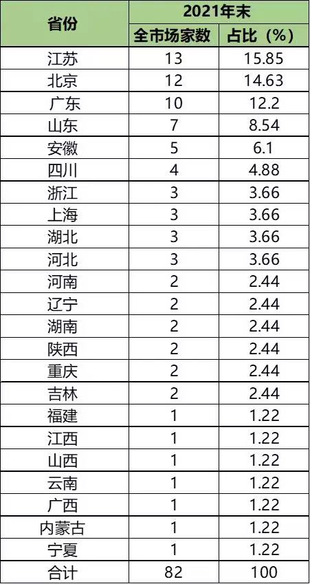 2021年11月15日,北京证券交易所正式开市。截至2021年末,北交所共有82家上市公司,主要集中在江苏、北京和广东三地,市值范围在10亿—20亿元的范围占比最多,市值最大的三家公司合计占北交所总市值超40%。