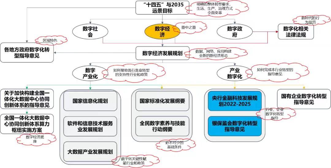 从“产业数字化”方向上看,国资委2020年9月出台的《关于加快推进国有企业数字化转型工作的通知》较早提出了对企业的数字化转型指导要求,并明确提出了 “以企业架构为核心构建现代化IT治理体系”,“探索构建适应企业业务特点和发展需求的“数据中台”“业务中台”等新型IT架构模式”等数字化转型方向。对银行业的数字化转型实操具有明确指导要求的两份文件也属于“产业数字化”这个方向,也需要在对整个文件体系的理解下进行解读。