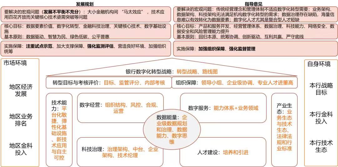 这两份指导文件体系完整,立意高远,对实际执行的指导和要求也很充分,综合解读更有利于银行贯彻落实。数字化转型是所有银行的必选动作,因为这不仅是单个机构的问题,是数字经济建设的要求,是银行以数字金融的形态配合、支持数字经济发展的“规定动作”。经济转型会带来机会,也必然会带来淘汰,要避免成为业务发展没有起色、数字化转型又跟不上的“落后产能”,近几年银行业的兼并重组时有发生,这种事情也同样可能出现在数字化转型过程中。当然,数字化转型并不是“一刀切”的执行过程,不同类型的机构转型速率会参考不同地区经济环境、科技环境、自身能力有所不同,这也是图中会列出“市场环境”、“自身环境”这两个因素的原因。但是站在数字经济发展的长期目标来看,没有银行会成为数字化转型的“例外品”,因为数字经济最终会渗透到银行所有的客户身上,银行可以选择的只是转型进程而已,不能低估短期的转型困难,但是更不能忽视转型的长期必然趋势。