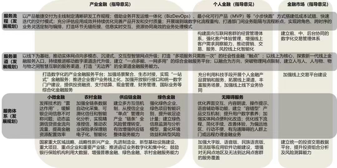 数字化最终要给客户带来更好的价值和体验,而客户最直接感受到的就是银行服务。“发展规划”提出“重塑智能高效的服务流程”,通过采用业务开发运维一体化(BizDevOps)、最小化可行产品(MVP)、仿真模拟、可用性测试、净推荐值(NPS)调研、机器人流程自动化(RPA)、自然语言处理(NLP)、智能字符识别(ICR)等技术重塑服务流程,“实现跨角色、跨时序的业务灵活定制与编排”;“搭建多元融通的服务渠道”,通过采用5G、增强现实(AR)、混合现实(MR)、应用程序接口(API)、物联网等技术“打造“无边界”的全渠道金融服务能力”;“打造数字绿色服务体系”,通过采用大数据、人工智能、移动物联网、卫星遥感、电子围栏、电子签章、远程音视频等技术“缓解银企间信息不对称问题”,“提高农村地区金融服务下沉度和渗透率”,“有效増强供应链金融整体服务能力”,“提升绿色金融风险管理能力”,这一部分是“发展规划”中出现技术种类最多、最密集的部分,也体现了对数字化银行的技术驾驭能力的要求,综合这些技术类型看,就算深层次的业务本质没有改变,数字化银行也堪称是一个“新物种”了。“指导意见”则是按照业务领域划分提出的要求,产业数字金融方面,“打造数字化的产业金融服务平台”,“加强开放银行接口和统一数字门户建设”,“推进函证业务数字化和集中化”;个人金融服务方面,“拓展线上渠道,丰富服务场景,加强线上线下业务协同”,对互联网客户群体、老龄和残障客户群体、无网点覆盖客户群体,分别提出了不同的服务要求,旨在“推动解决“数字鸿沟”问题”;金融市场交易业务方面,“加强线上交易平台建设”和“建立统一的投资交易数据平台”是重点任务。在数字服务部分,“发展规划”侧重从体系建设方面横向提出的要求,“指导意见”则侧重从业务领域方面纵向提出的要求,二者横纵交织恰好构成一个二维矩阵式的转型要求,如下图所示:
