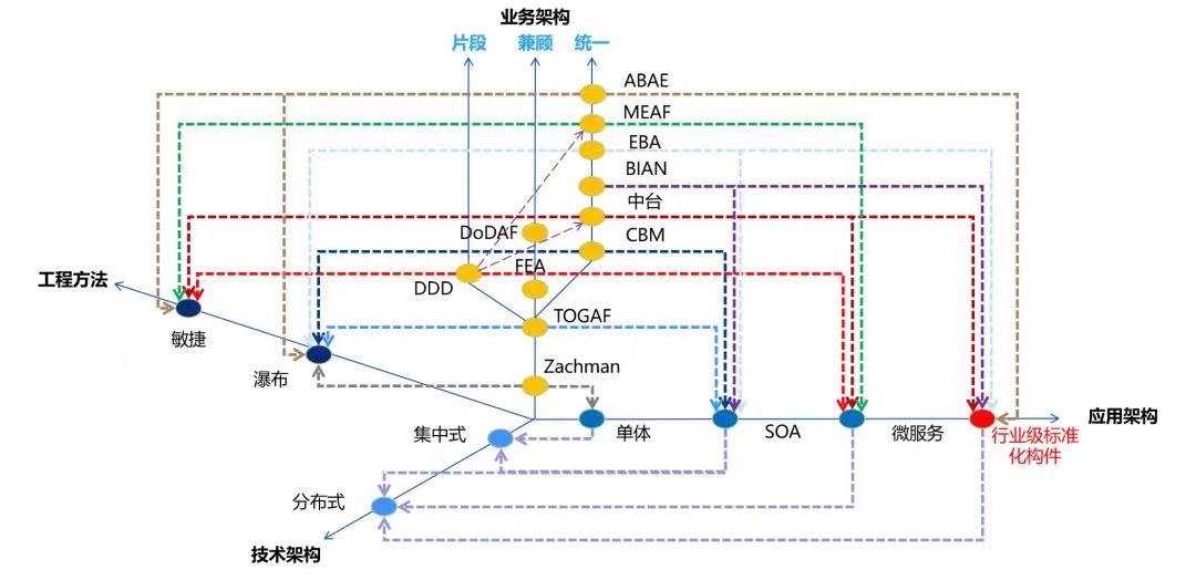 企业架构的确是一种有效的全局规划和落地执行方法,尽管看起来有些笨重,但实际上,这往往有些误解,它的“重”是源于工程规模的,不是所有的企业架构执行都会很“重”,比如,一些中小企业的数字化建设,也是在梳理全局业务的基础上,去对薄弱环节、业务痛点进行数字化改进,其实施也未必很重。那么企业架构有多少种呢?“发展规划”中提到的“中台架构”与“指导意见”中提到的“企业架构”是什么关系呢?《聚合架构:面向数字生态的构件化企业架构》一书把企业架构理论发展的沿革梳理了一张图,本文借鉴如下: