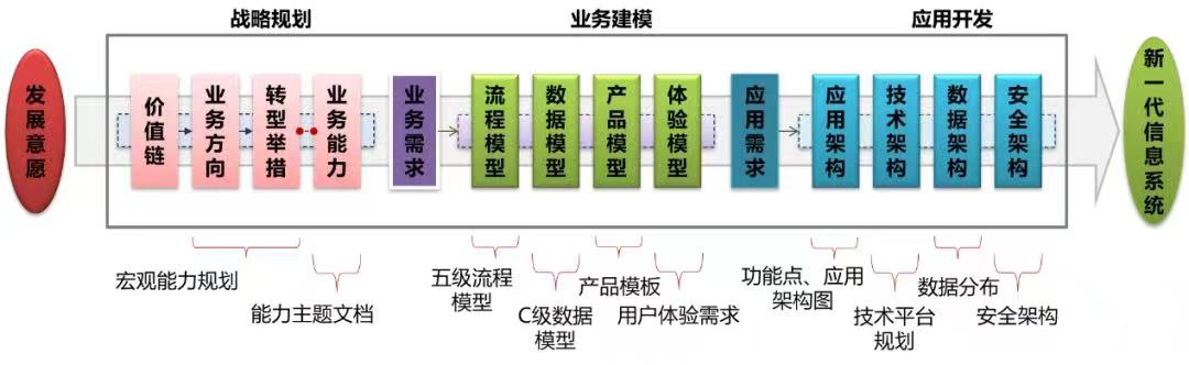 完整的企业架构设计包括企业级业务架构设计和由业务架构驱动的企业级IT架构设计。企业级业务架构设计包括对战略的分解,对企业级价值链的设计,基于业务领域和价值链进行的、融合用户体验的企业级业务横向整合设计,基于业务和数据的设计,提炼数字时代的“业务能力”,也就是通过一定的业务操作来处理一定的业务数据去实现业务目的的过程,这是一套面向数字时代的业务规划方法,也要求业务人员能够同时面向业务和数据进行业务能力分析,可以完成这个任务,那么业务人员的数字化能力转型也就完成了最关键的一项:设计数字化背景下的业务和产品。当然,这个过程不是业务人员独立完成的,是要由业务人员和技术人员共同进行的,这也是业务和技术深度融合最关键的环节:由二者共同深入分析业务,不是面向需求,而是面向业务变革。这一环节是建设“指导意见”中提到的“企业级业务平台”的基础,也是“发展规划”中提出的“业务中台”的建设基础。