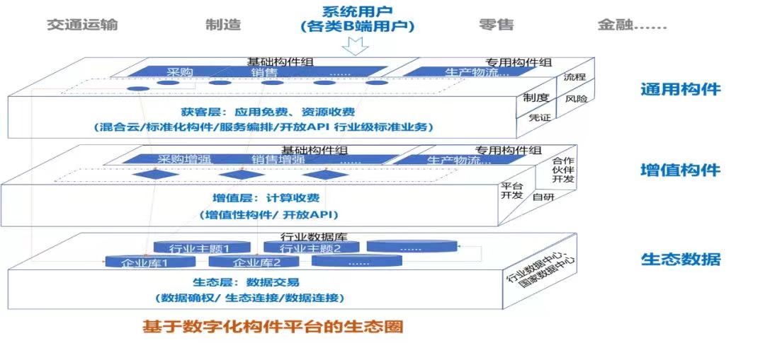 为了进一步帮助中小银行的架构设计能力提升,监管机构可以组织行业级的开源、开放,请企业架构建设的先行机构将粗粒度的架构资产、工艺推广为团标、行标,这样既可以方便中小型银行参照,又能屏蔽业务细节,保护商业秘密,也能响应国家标准化建设发展要求,提升行业的业务、产品标准化程度。国家也提出希望行业龙头企业联合软件企业共同设计行业通用软件,很多人也认为国家数字化转型带来了行业云、SaaS软件新的发展机遇,其实这样的机遇不仅是来自国家政策,也是技术发展的必然趋势,如今在国家政策的推动下,这个趋势可能会发展的更快了。《聚合架构:面向数字生态的构件化企业架构》一书中描绘的基于行业级标准化构建的数字化构件平台,就是这样的愿景: