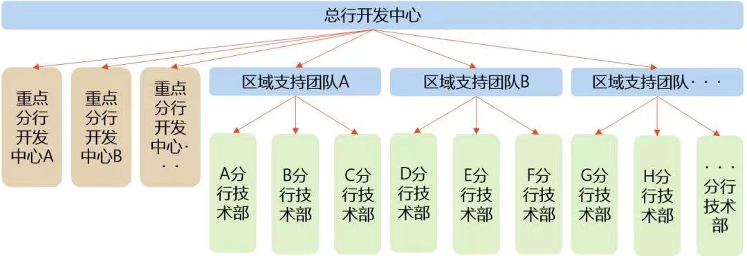 如果要增强基层对技术运用能力的拓展,就意味着全行技术团队需要有合适的布局,也就是总行与分行开发力量的配置问题。大型银行以集中开发模式居多,但是基于深度连接的业务也会具有一定的个性化特征,如何保持总分行间开发力量的合理布局,使面向大企业、行业大平台的需求和区域特色业务的开发都能得到适当的支持,是比较考验整体布局能力的,是否应该总行和分行都配置足够的开发力量,还是总行和跨分行的地区性服务团队相结合,这方面很难有定论,如果分行都配置足够力量,则开发能力过于分散;如果在总行之下再设置一层跨地区的开发机构,则管理和考核上又不好处置。本文认为,目前折中一些的配置方式是总行建立较大的集中式科技团队,选择重点地区的分行建立规模适当的科技团队,然后其他分行归总行团队支持,并在总行中设置分区域的支持团队,结构如下图所示: