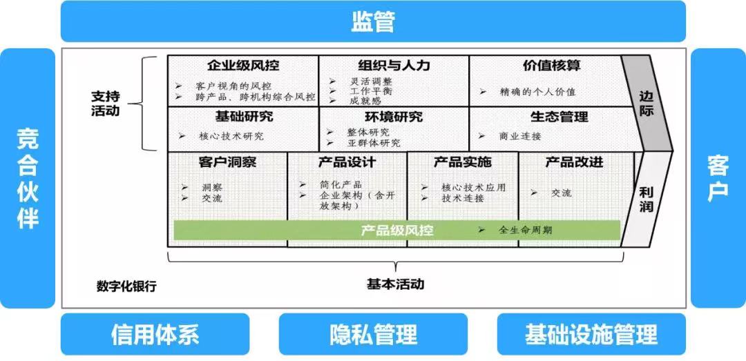 无障碍服务能力也是两份文件重点关注的内容,提供无障碍服务能力的手段不少,不过本文拟集中阐述的是视频银行,尤其是移动渠道的视频化。《银行数字化转型》中曾尝试定义过数字化银行的价值链,其图示如下: