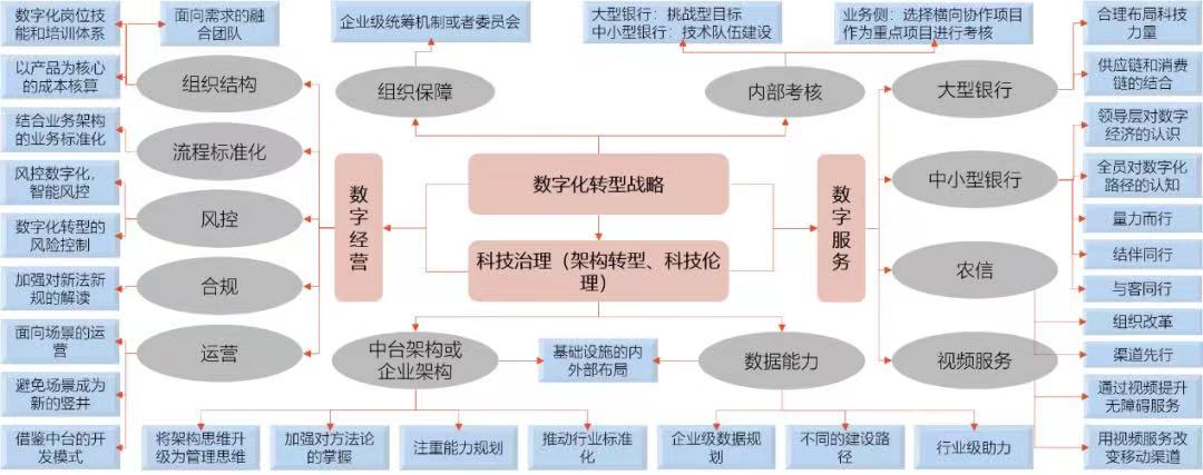 A、组织保障方面。数字化转型管理组织一定要设立,从推动角度来讲,数字化必然会涉及业务流程的深层次梳理,数字化转型一定会涉及流程变革,这类变革一般都是跨领域的,没有一个“企业级统筹协调机制”推动一定会有困难。目前大型银行基本都已经建立数字化转型办公室,中小型银行也应该尽快建立专职或者兼职的转型管理机构,这些也都是很容易在考核时衡量的动作。但是仅有一个推动组织是不够的,跨领域协调机制需要延伸到业务条线的管理中,也就是必须是“总分结构”的,最好业务部门有一把手或者专职副手参加到实际工作中,仅靠业务骨干的力量是不够的,这同样也要求,这种协调组织的领导者必须是行里的“一号位”。