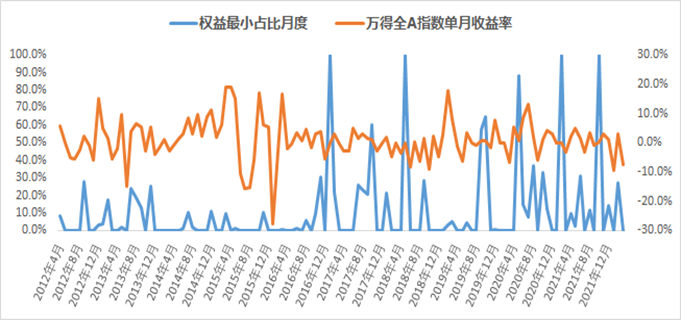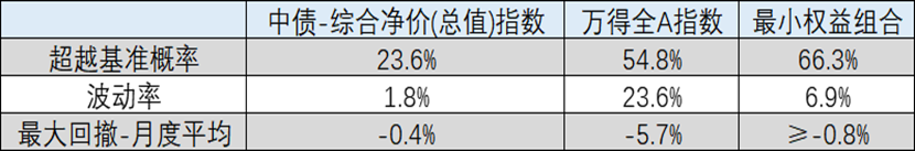 经统计过去十年各月度最小权益配置比例,其中权益配置比例为零的情形主要为单月固收收益表现优于权益,或虽权益优于固收,但单纯配置固收类资产收益高于收益目标(4%)。需要说明的是,最小权益配置模型下,获取超额收益并非其主要目标,此外,收益目标实现与否依赖市场表现,未考虑主动管理能力。