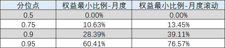 由表1可知,基于每月收益率和滚动每月收益率,不同分位点下权益配置存在明显差异。以收益率月度滚动维度下的最小权益比例分位点为例,权益最小比例中位数为0%,即中性偏谨慎的情况下,仅配置固收类资产,75%分位点(稳健)内配置比例不高于14%,75%-90%分位点(平衡)内配置比例大概为14%-40%,90%-95%分位点(进取)内配置比例大概为40%至80%,而95%分位点以上(激进型)则权益配置大致为80%以上。