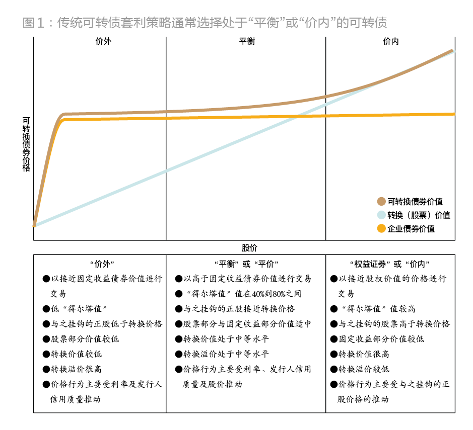 传统上,可转债套利聚焦于可转换债券里隐含看涨期权的估值。该策略通常运用定量工具来确定错误定价隐含的波动性,并选择流动性良好、信用质量较高、处于“平衡”水平(即“平价”)或“权益证券”(即“价内”) 的可转债(图1),这些债券的发行人通常都是资产负债表稳健、信用曲线有目共睹、广受投资者追捧的企业。