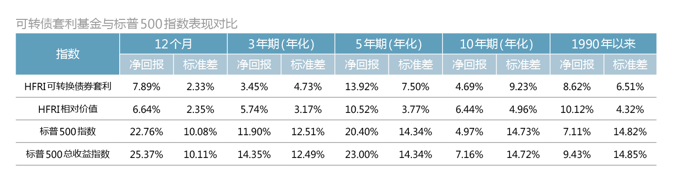 从历史比较可以看出,可转债套利基金的长期表现略逊于标普500总收益指数,波动性亦相对较低(附表)。2008年全球金融危机期间,为了应付经纪人追加保证金的要求,相关基金经理不得不进行平仓,其投资组合因此遭受了重大的市值计价损失,可转债套利基金的规模大幅下降。这是因为流动性不足打破了多头户与空头户之间的关联性,对冲工具(例如信用违约互换)失去了作用。金融危机过后,这一策略受益于可转换债券市场的价格复苏,而隐含波动率始终保持低迷。
