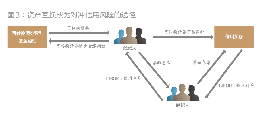 资产互换为基金经理提供了对冲信用风险的途径。许多投资银行和经纪公司的客户都愿意投资可转换证券的固定收益部分,却并不想持有其中的看涨期权成分,资产互换便由此产生。资产互换将可转换债券分为两个隐含的部分:固定收益部分和股票看涨期权。资产互换涉及持有股票期权的“信用卖方”(即可转换债券套利经理)和取得固定收益部分的“信用买方”。通常情况下,可转换债券经理以低于市场价的售价向信用买方出售可转换债券。这个售价一般为债券下档保护(bond floor),即按照LIBOR加上固定的信用利差贴现的债券未来现金流(息票与还款)的现值。