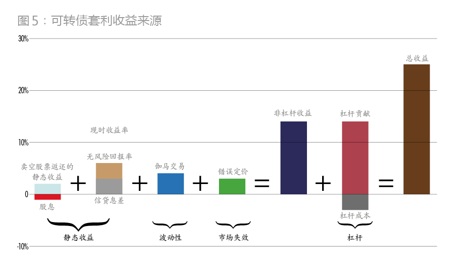 采取可转换债券套利策略的基金经理有三方面收益来源:票息收益和卖空股票返还的静态收益,股票波动的伽马交易,以及因错误定价带来的收益(图5)。