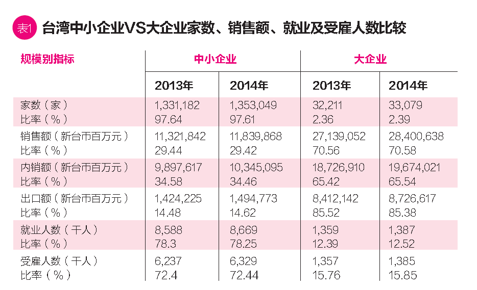 中小企业在产业结构转型中向来扮演重要角色。台湾中小企业于2014年有1,353,049家,占全部企业家数的97.61%。中小企业占全部就业人数比率达78.25%(表1),但自2011年后成长趋缓,显示中小企业主在面对不确定的经济情势下雇用人力较为保守。中小企业以经营服务业为主,2014年中小型服务业计1,078,648家,占全部中小企业的79.72%。虽然服务业部门家数众多,约为工业部门家数的4倍,但服务业部门与工业部门的销售额,各占中小企业销售额近5成。