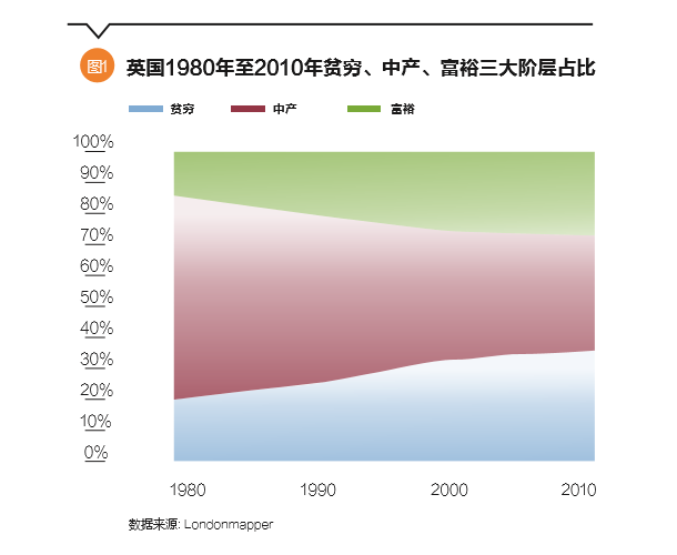 从英国1980年来的中产阶级规模变迁,我们可以理解这种不满的来源。1980年至2010年,英国中产阶级家庭占比从65%降至37%,消失的中产相当一部分滑入低收入区间。中产塌陷的同时,英国收入的不平等程度也有提高。这种社会变迁难免增加社会不同阶层间的矛盾。哥伦比亚大学教授Sach就认为,退欧公投表面上是对移民的不满,实质是工薪阶级和富人之间的斗争。