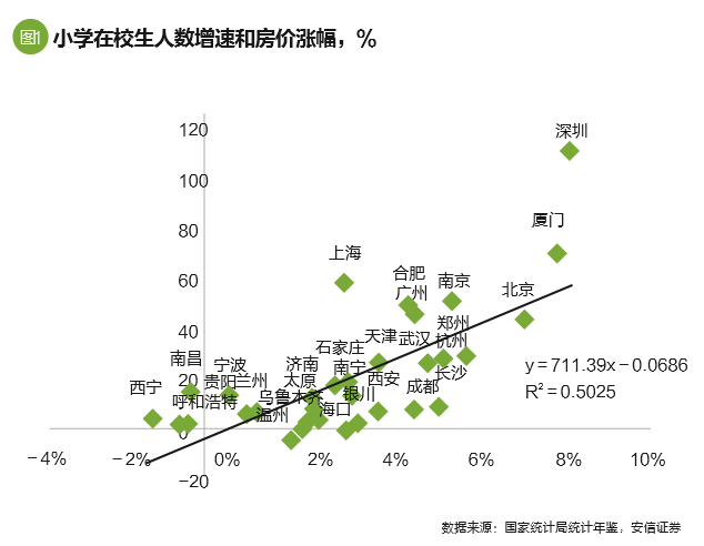 如果年轻的父母集中去选择一些教育资源非常好的城市,这些城市的人口流入就在上升,并导致了这些城市劳动力市场的供应上升和居民可支配收入增速放慢,同时表现为小学在校生人数增速上升、房价上升,以及住宅新开工上升。